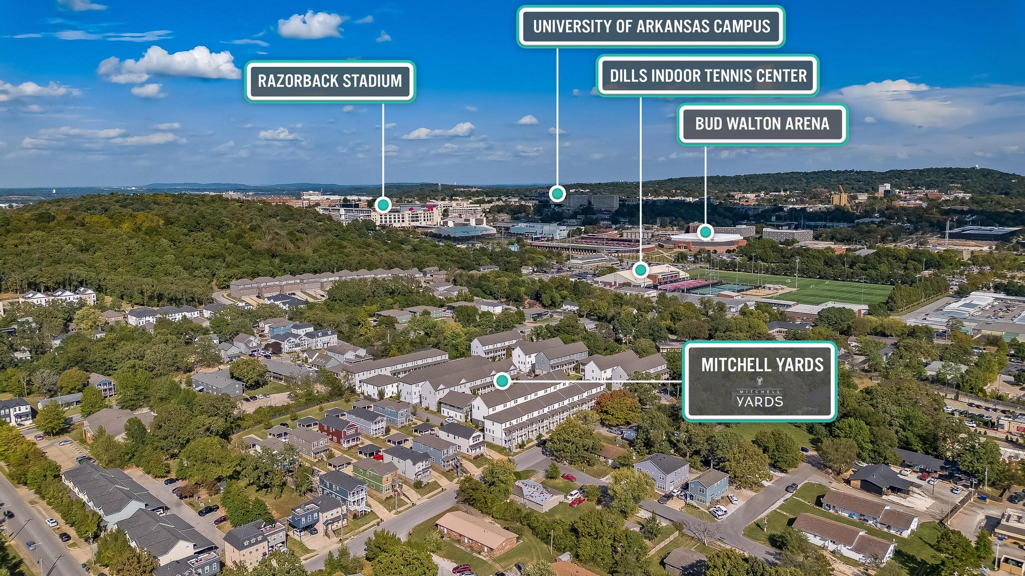 Aerial view of Mitchell Yards student housing in Fayetteville, AR — located near the University of Arkansas campus, Razorback Stadium, and key student amenities.