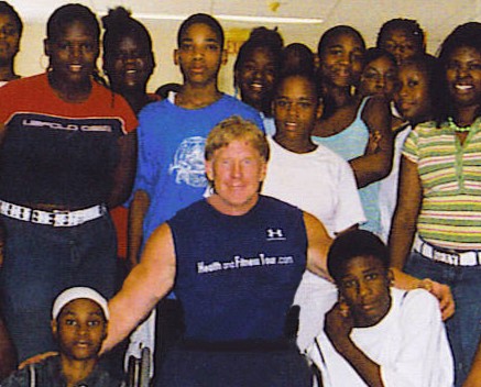 Man in a wheelchair next to a group of students.