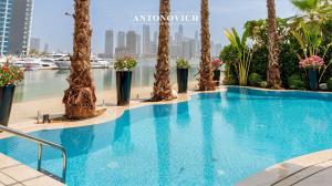 Infinity-Edge Design: The pool features a modern geometric shape with a prominent infinity edge. This design creates a seamless visual connection to the Arabian Gulf, making the pool appear to merge with the sea beyond.